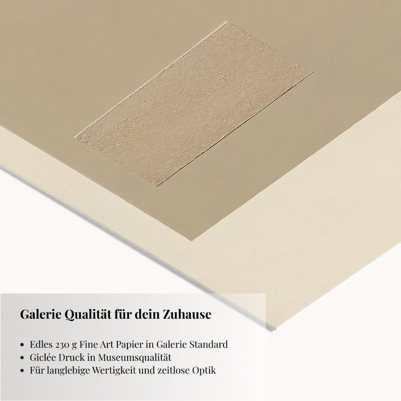 Leichte Unterschiede sind möglich, weil jeder Bildschirm Farben anders darstellt. Unsere Drucke werden jedoch kalibriert produziert, damit sie der Bildwirkung so nah wie möglich kommen. Die gedämpften, ruhigen Töne sind bewusst gewählt, damit die Kunst in modernen Interiors natürlich wirkt.
