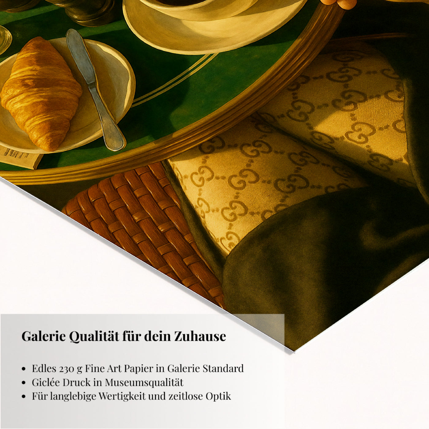 Made Of Sun fängt die stille Eleganz pariser Morgen ein. In warmes, bernsteinfarbenes Licht getaucht liegen zwei unberührte Croissants neben dampfendem Kaffee, begleitet vom leisen Rhythmus eines Gesprächs. Der Glanz von Porzellan, weiche Stofffalten und Sonnenlicht auf einer grünen Tischfläche verdichten einen Moment von Präsenz und Ruhe. Die Szene verbindet realistische Details mit poetischer Stille und macht aus dem Alltäglichen ein Bild von Wärme und Reflexion.