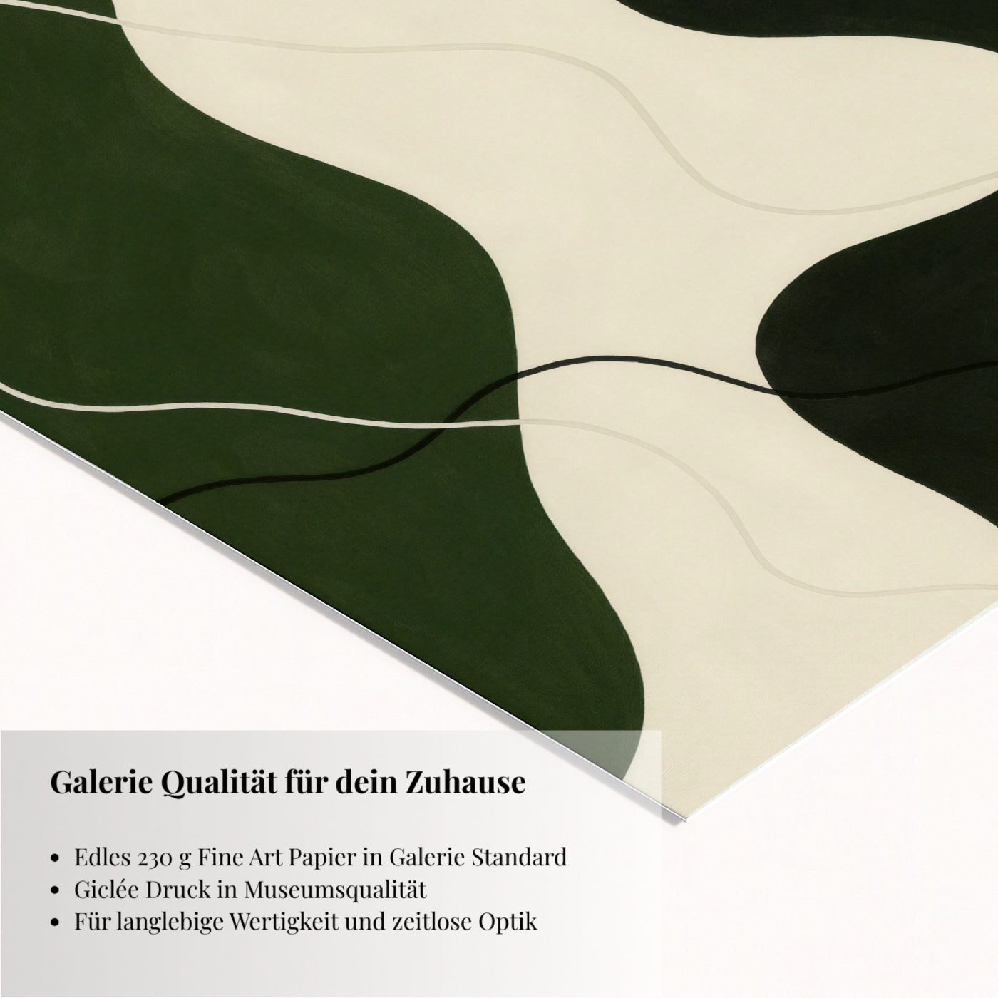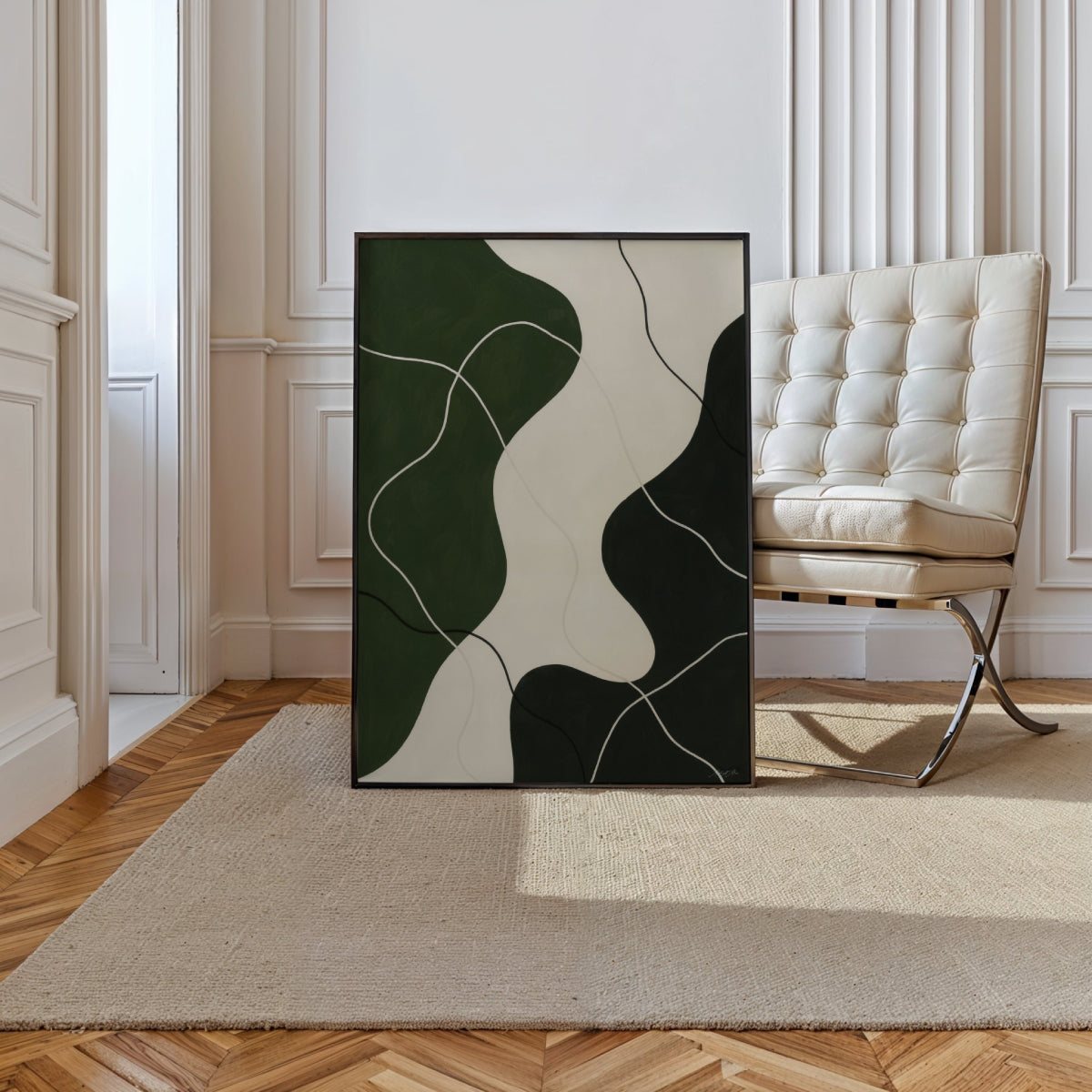 Merge ist ein ruhiges, skulpturales abstraktes Werk, geprägt von fließenden Formen und sanften Tonverschiebungen. Tiefes Waldgrün trifft auf weiche Cremeflächen und erzeugt eine organische Bewegung, die zugleich geerdet und leicht wirkt. Feine, geschwungene Linien führen den Blick mit leiser Präzision durch die Komposition und schaffen ein ausgewogenes Spiel aus Kontrast und Harmonie. Die Anordnung erinnert an natürliche Pfade und subtile topografische Strukturen.