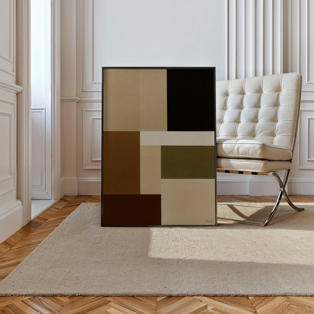 Nothing Feels Empty Tonight ist eine elegante geometrische Studie, die klare Struktur mit erdiger Wärme verbindet. Ausgewogene Flächen in Beige, Olive und tiefem Braun formen einen ruhigen Rhythmus, der zur stillen Betrachtung einlädt. Feine Tonabstufungen und präzise Schichtungen verleihen der Oberfläche eine sanfte Tiefe und unterstreichen die minimalistische Klarheit. Die Komposition wirkt bewusst, harmonisch und zeitlos.