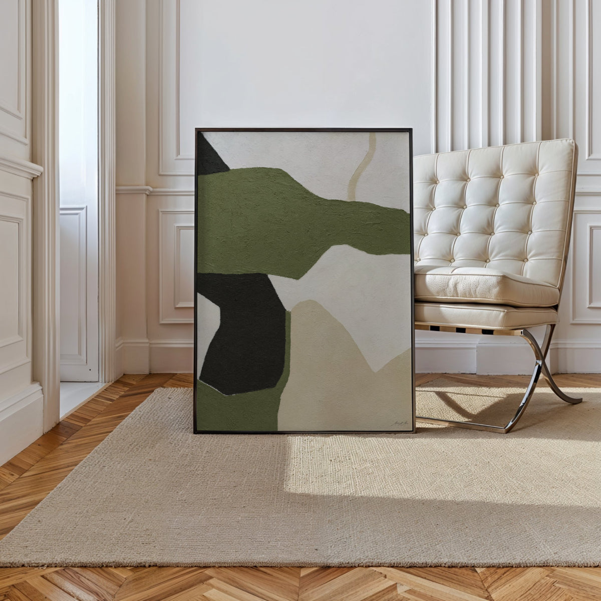 See You in the Holidays zeigt eine warme, geerdete abstrakte Komposition, in der erdige Grüntöne, sanftes Beige und tiefes Schwarz in einem ruhigen, organischen Rhythmus aufeinandertreffen. Die strukturierte Oberfläche verstärkt die natürliche Anmutung und lässt jede Form mit leiser Ausgewogenheit wirken. Sanft geschwungene Elemente erinnern an eine abstrahierte Landschaft und verbinden zeitgenössische Klarheit mit vertrauter Wärme. Subtile Tonübergänge verleihen Tiefe, ohne das Auge zu überfordern.