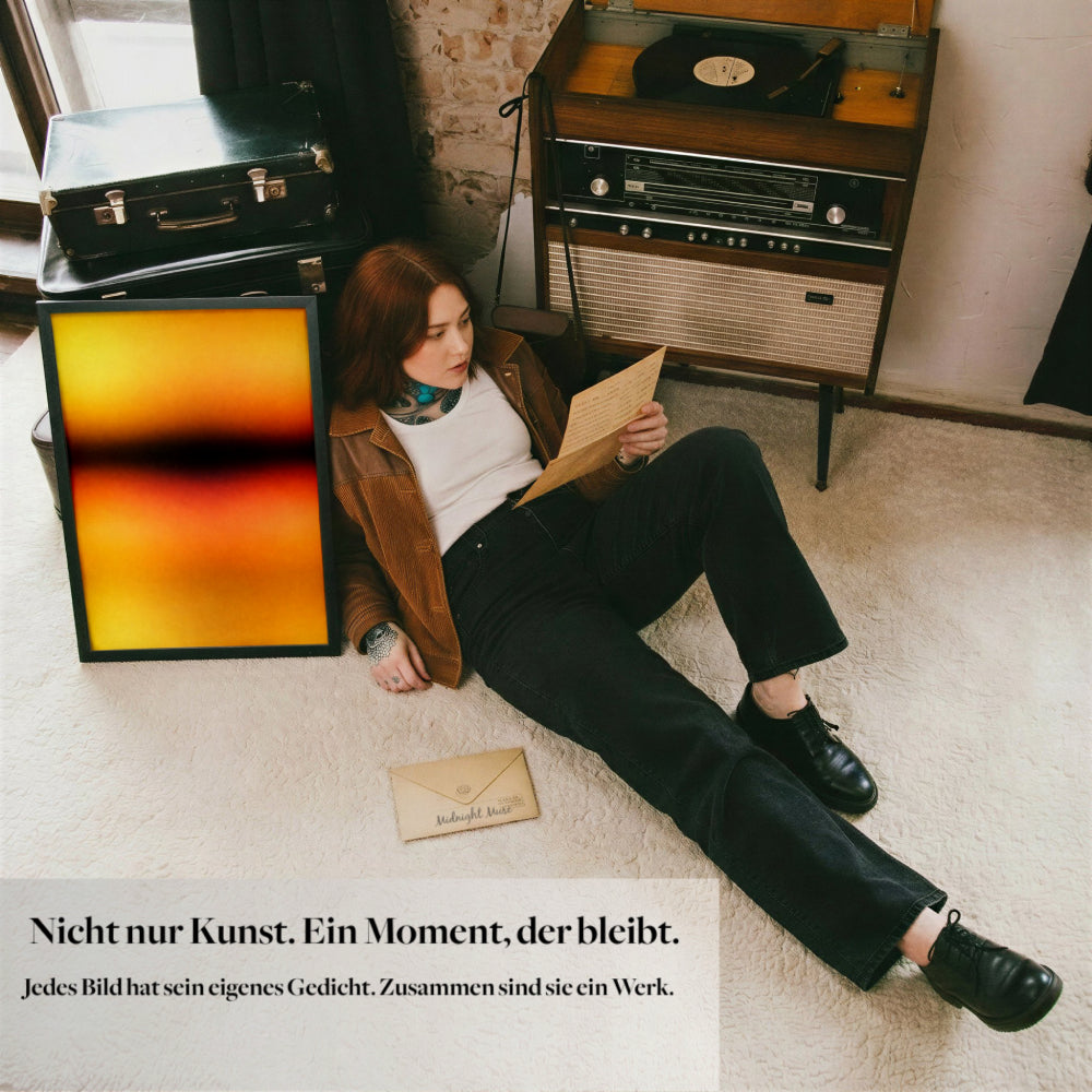 Weil Midnight Muse Kunst als Zusammenspiel von Bild und Bedeutung versteht. Das Gedicht ist kein Zusatz, sondern Teil des Konzepts. Es übersetzt die Stimmung des Werks in Sprache und verankert es emotional. So entsteht keine reine Wandkunst, sondern ein persönlicher Bezug, den viele bewusst aufbewahren, separat rahmen oder in ihren Alltag integrieren.