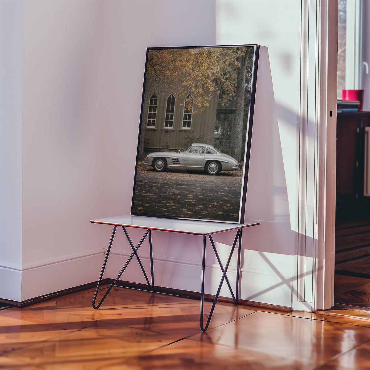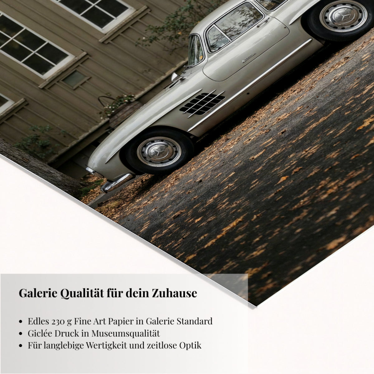 Timeless Dieses Werk strahlt eine leise Eleganz aus, in der sich klassische Form und herbstliche Stille begegnen. Der silberne Körper des Fahrzeugs ruht unter goldenem Laub wie ein Gedanke außerhalb der Zeit. Die Komposition verbindet nostalgische Anmut mit moderner Kunst und entfaltet eine ruhige, kontemplative Tiefe, die zeitgenössische Malerei und hochwertige Wandkunst auf poetische Weise vereint.
