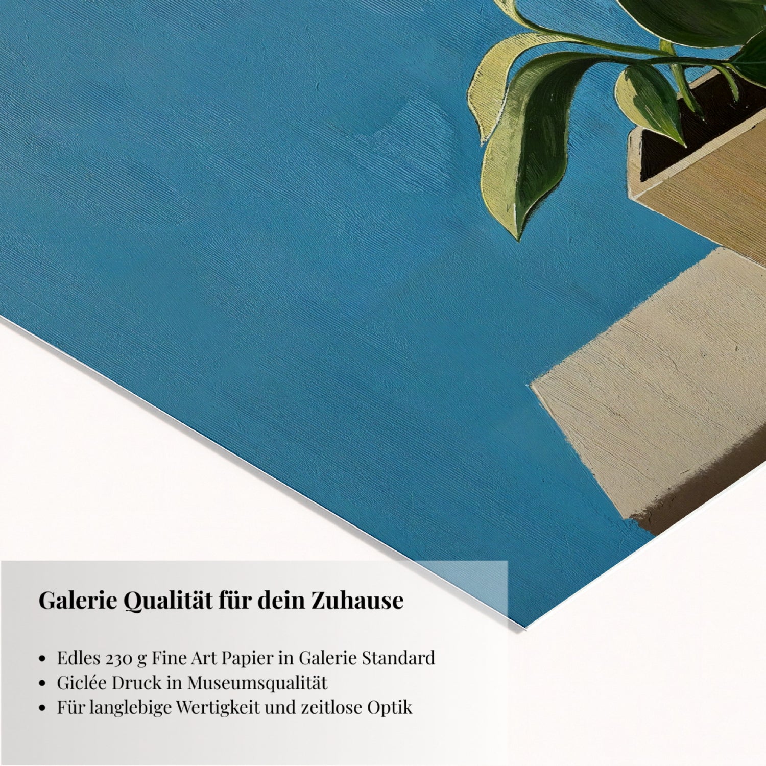 Bloom in Blue zeigt eine stille, ausgewogene Komposition aus Pflanze, Licht und Raum. Vor einem weiten, himmelblauen Hintergrund ruht eine einzelne Topfpflanze, deren Blätter mit feiner Zurückhaltung ausgearbeitet sind. Die reduzierte Szene strahlt Ruhe, Klarheit und moderne Leichtigkeit aus.