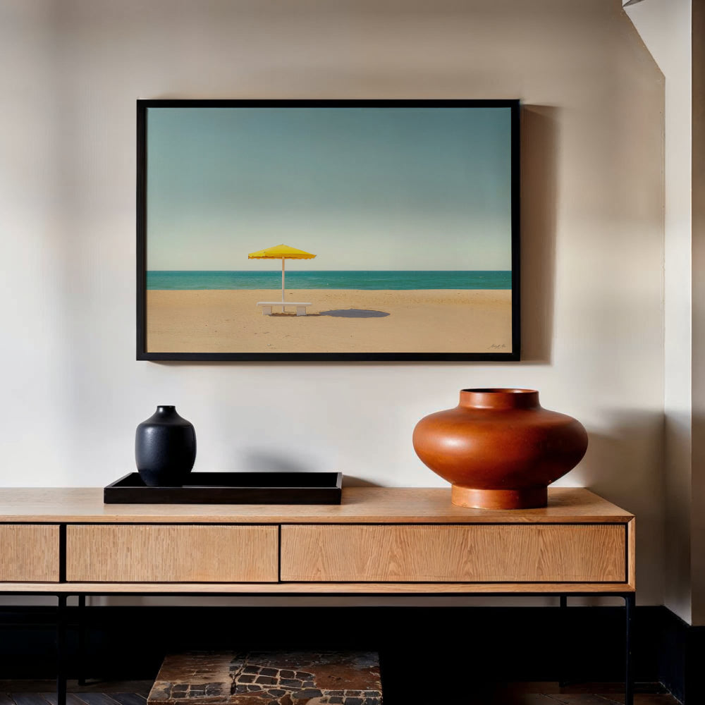 A Pause in Blue fängt die leise Poesie eines stillen Sommermoments ein. Ein einzelner gelber Sonnenschirm steht am offenen Ufer, sein feiner Schatten auf warmem Sand, während das Meer ruhig in den Horizont fließt. Reduzierte Elemente, weiche Blautöne und sonniges Licht schaffen Klarheit, Ruhe und ein Gefühl von gelassener Präsenz.