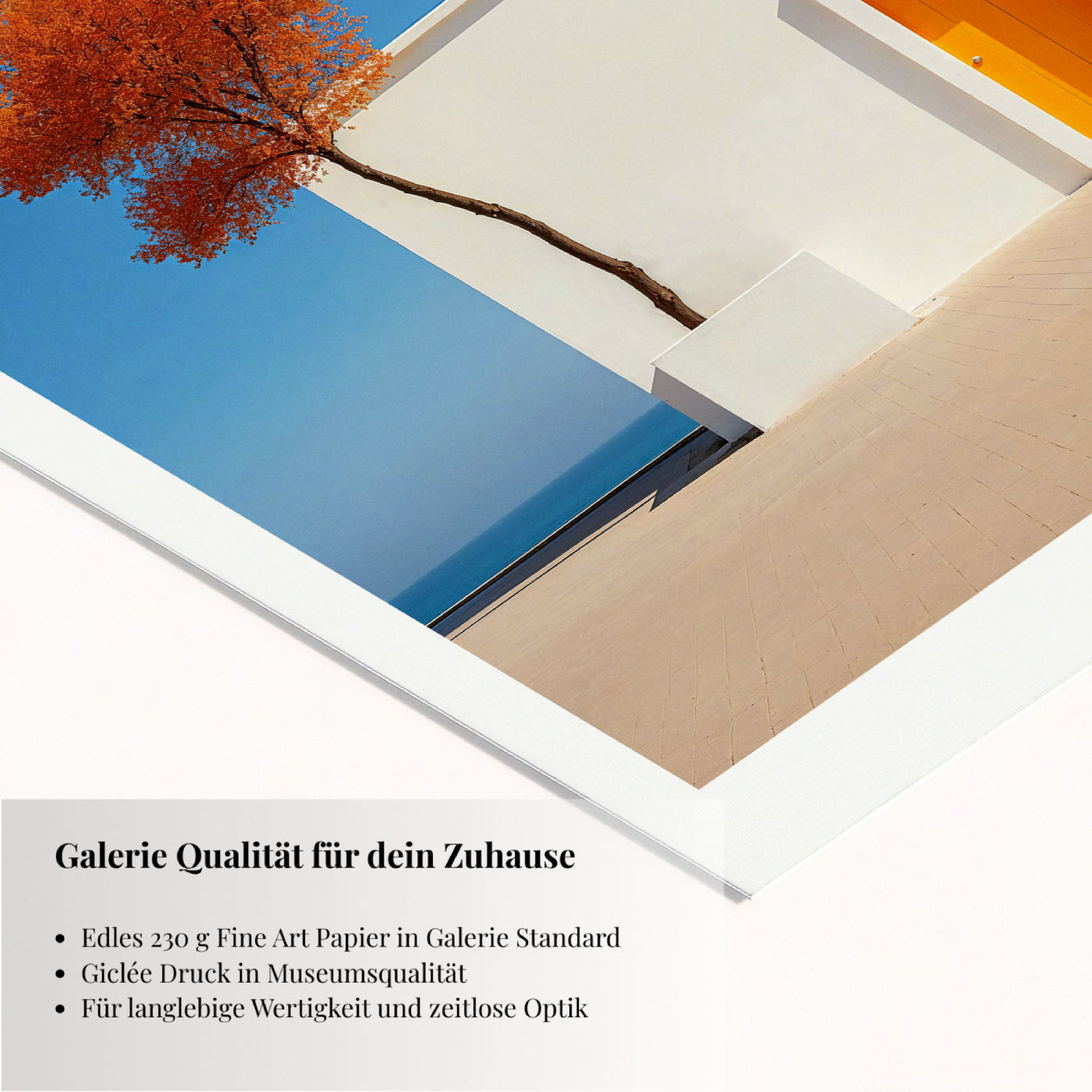 Sky and Ember fängt den ruhigen Dialog zwischen Architektur, Natur und reiner Farbe ein. Ein einzelner bernsteinfarbener Baum erhebt sich elegant neben einer klaren weißen Wand, sein leuchtendes Laub glüht wie Feuer vor dem ruhigen Blau des Himmels. Die Komposition lebt von Harmonie und bewusster Zurückhaltung und verbindet klare Flächen mit emotionaler Wärme. Farbe und Licht werden zum Träger von Ruhe, Klarheit und zeitloser Eleganz.