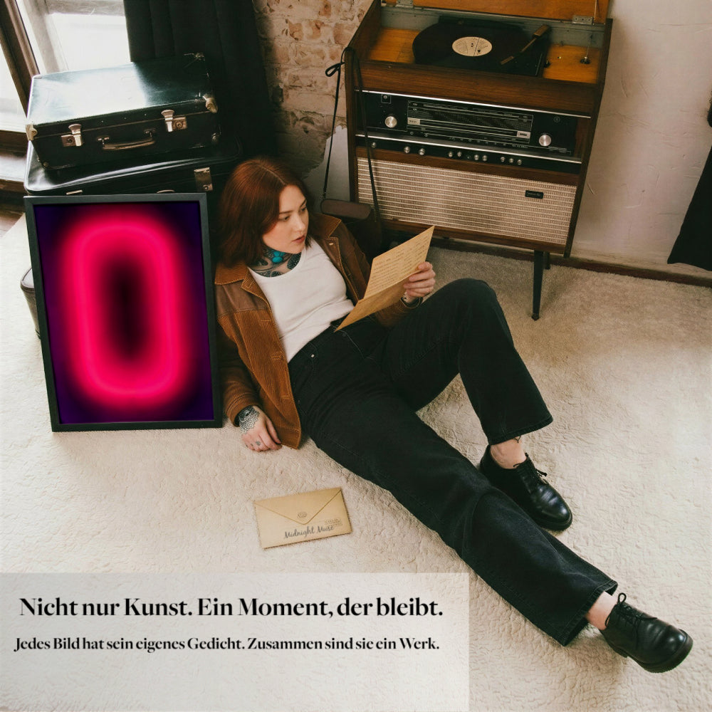 Weil Midnight Muse Kunst als Zusammenspiel von Bild und Bedeutung versteht. Das Gedicht ist kein Zusatz, sondern Teil des Konzepts. Es übersetzt die Stimmung des Werks in Sprache und verankert es emotional. So entsteht keine reine Wandkunst, sondern ein persönlicher Bezug, den viele bewusst aufbewahren, separat rahmen oder in ihren Alltag integrieren.
