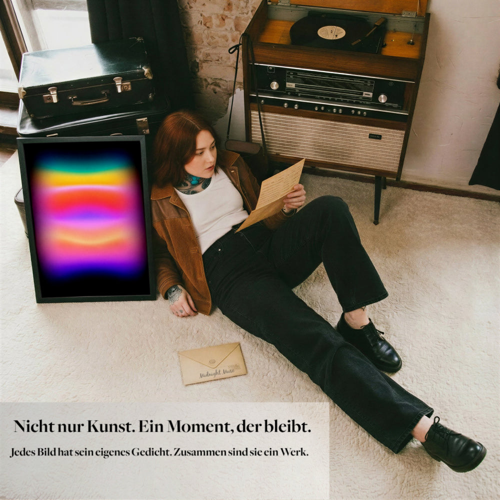 Weil Midnight Muse Kunst als Zusammenspiel von Bild und Bedeutung versteht. Das Gedicht ist kein Zusatz, sondern Teil des Konzepts. Es übersetzt die Stimmung des Werks in Sprache und verankert es emotional. So entsteht keine reine Wandkunst, sondern ein persönlicher Bezug, den viele bewusst aufbewahren, separat rahmen oder in ihren Alltag integrieren.