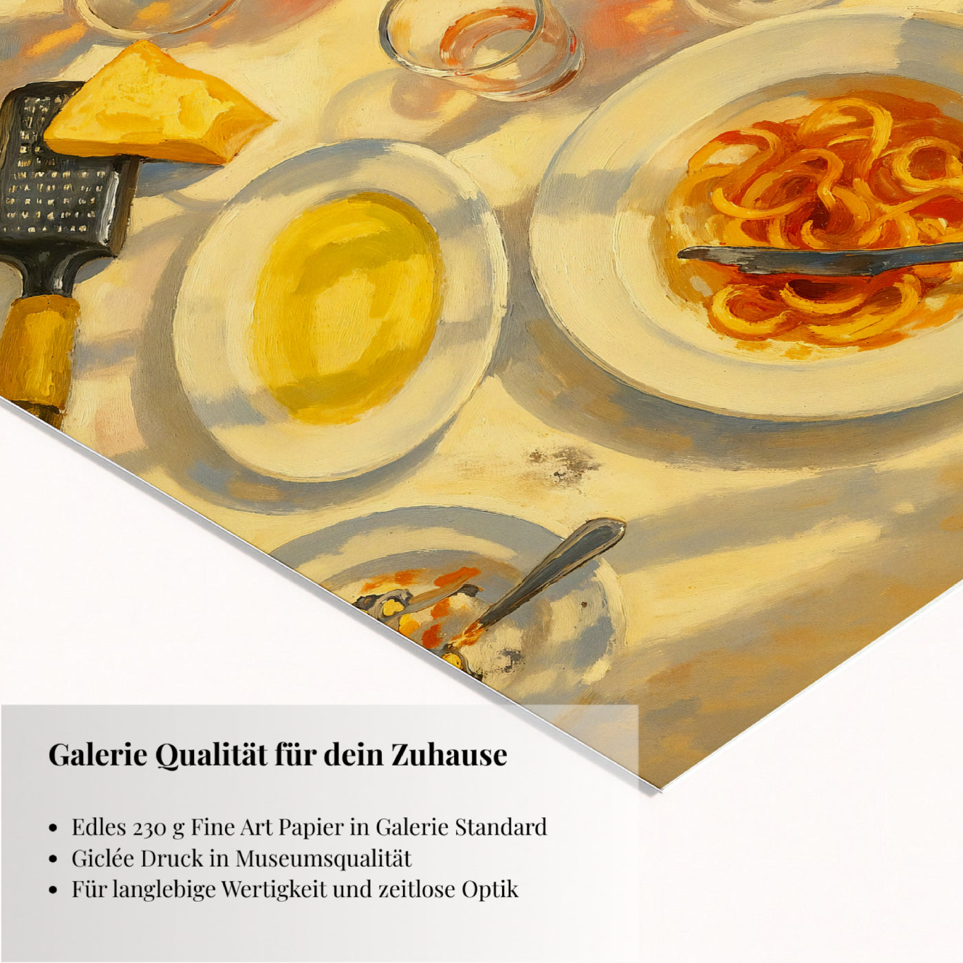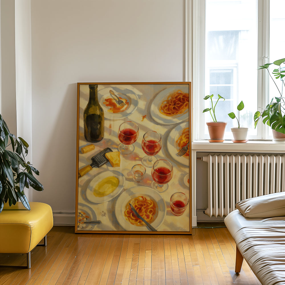 After the Feast fängt die zarte Schönheit eines gemeinsamen Moments ein, der gerade vergangen ist. Ein sonnengetränkter Tisch, Spuren von Wein, Pasta und Gesprächen, verwandelt Alltägliches in leise Poesie. Warmes Licht und sanfte Schatten bringen Bewegung in die Szene, während tiefe Rottöne und Goldnuancen in ruhiger Harmonie verschmelzen. Still, warm und von italienischer Lebensart getragen.