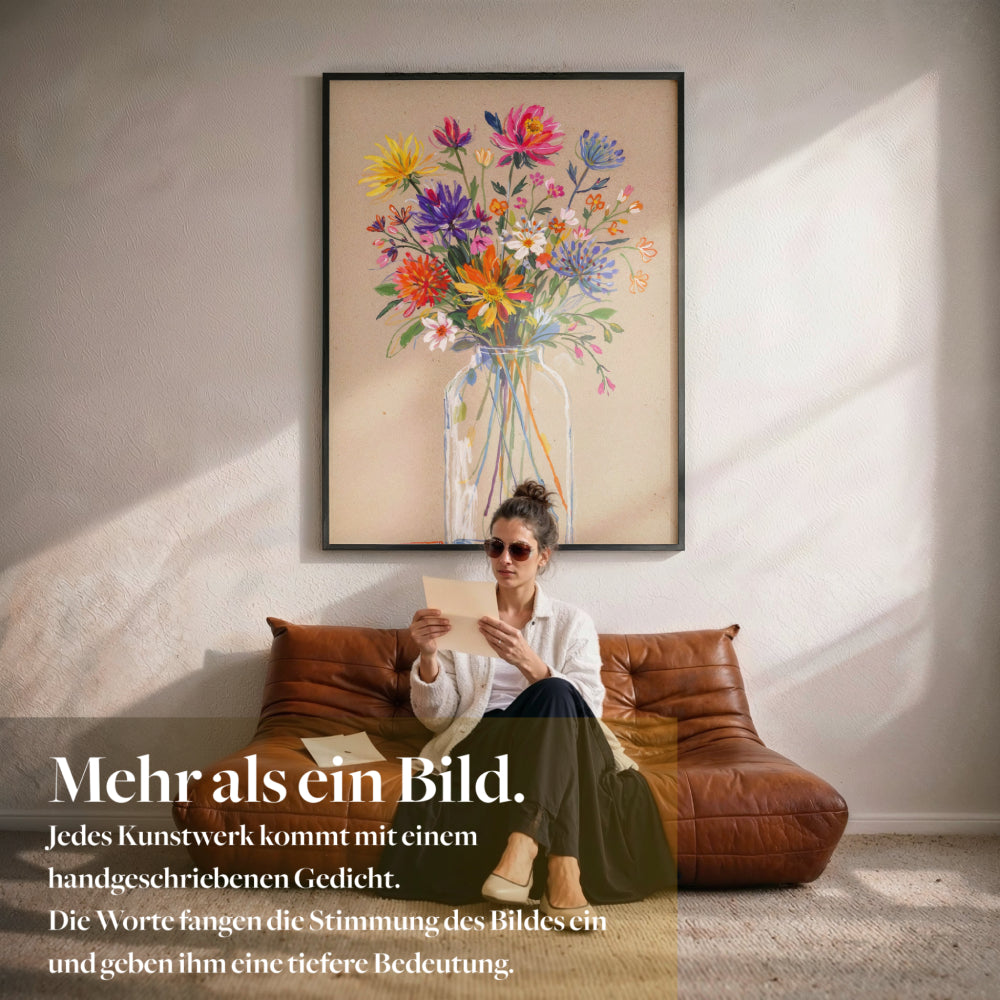 Du erhältst einen Galerie Fine Art Print auf schwerem, archivfestem Papier in Museumsqualität, gefertigt mit professioneller Giclée Technik. Wenn du einen Rahmen auswählst, kommt dein Kunstwerk fertig gerahmt zu dir, inklusive handgeschriebenem Gedicht Brief, bereit für deine Wand.