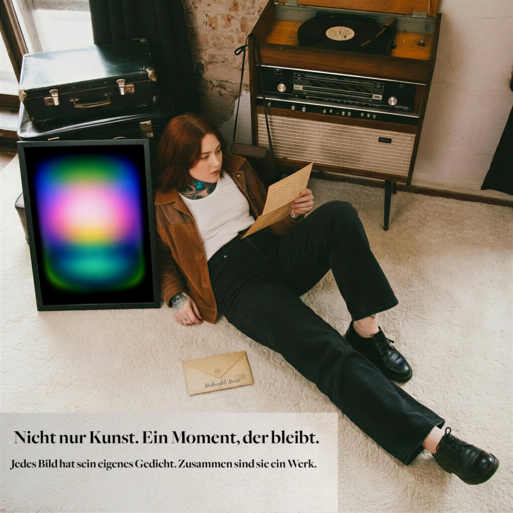 Weil Midnight Muse Kunst als Zusammenspiel von Bild und Bedeutung versteht. Das Gedicht ist kein Zusatz, sondern Teil des Konzepts. Es übersetzt die Stimmung des Werks in Sprache und verankert es emotional. So entsteht keine reine Wandkunst, sondern ein persönlicher Bezug, den viele bewusst aufbewahren, separat rahmen oder in ihren Alltag integrieren.