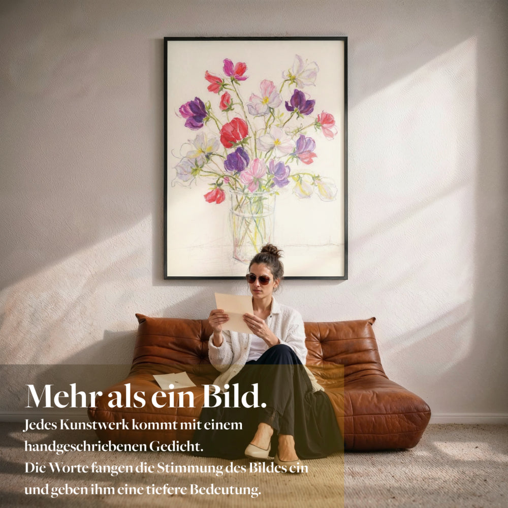 Die feinen Formen und Farben geben der Wand sofort Energie und lassen den Raum freundlicher und offener wirken. Die Komposition schafft eine natürliche Balance, die Ordnung und Lebendigkeit gleichzeitig spürbar macht. Dadurch entsteht eine Atmosphäre von Frische und Leichtigkeit, die deinen Raum aufwertet und ihm eine einladende, persönliche Ausstrahlung gibt.