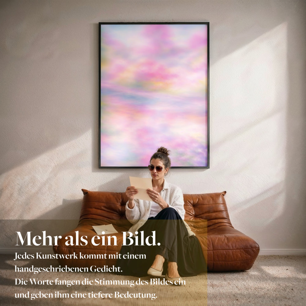 Du erhältst einen Galerie Fine Art Print auf schwerem, archivfestem Papier in Museumsqualität, gefertigt mit professioneller Giclée Technik. Wenn du einen Rahmen auswählst, kommt dein Kunstwerk fertig gerahmt zu dir, inklusive handgeschriebenem Gedicht Brief, bereit für deine Wand.