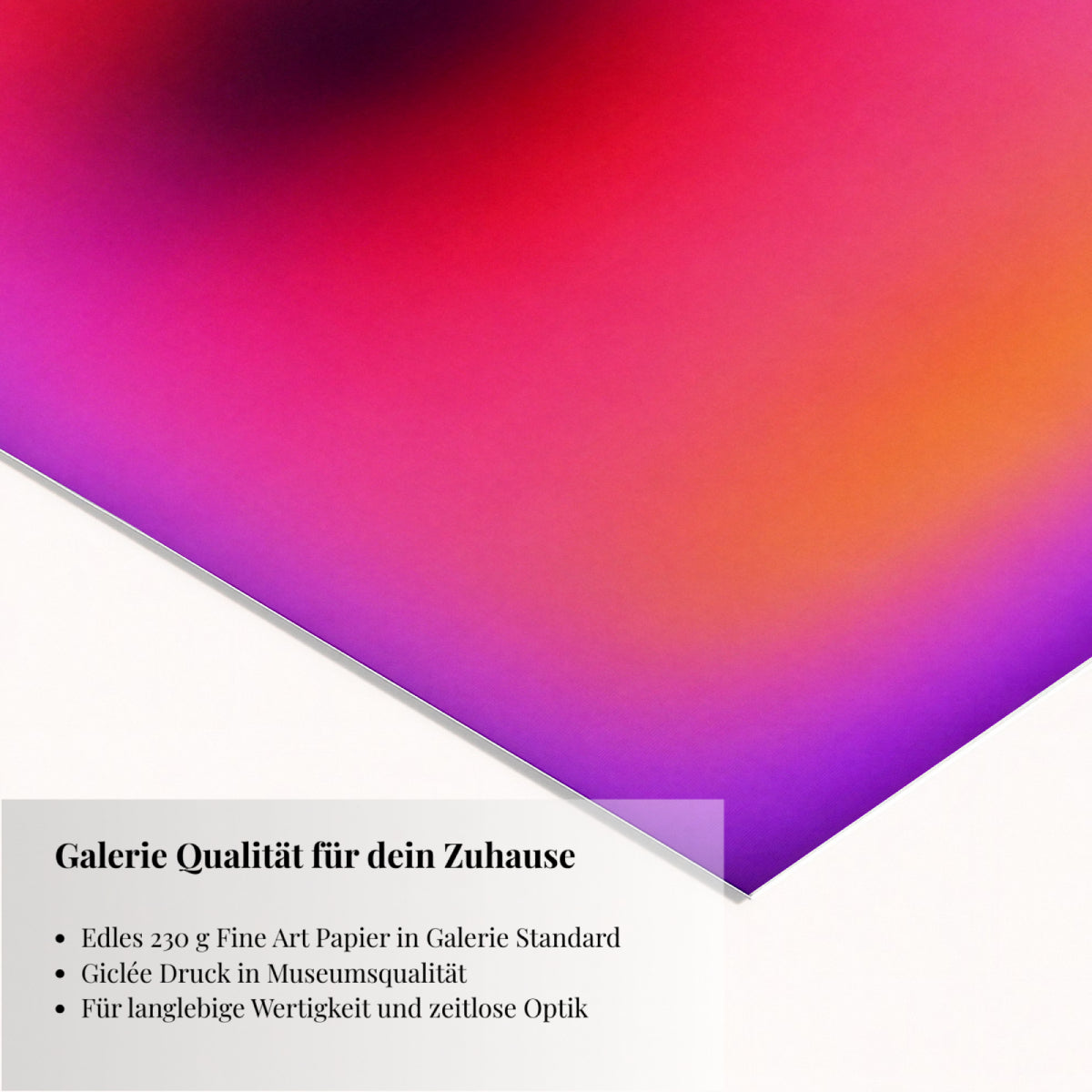 Der Druck erfolgt als Museum Giclée mit außergewöhnlicher Detailtiefe und präziser Farbwiedergabe. Gedruckt auf archivfestem 230 g Fine Art Papier entsteht eine langlebige Galeriequalität. Die matte, fein strukturierte Oberfläche verleiht dem Werk Tiefe, ohne zu spiegeln, und sorgt für eine hochwertige Haptik mit spürbarem Premium-Gefühl.