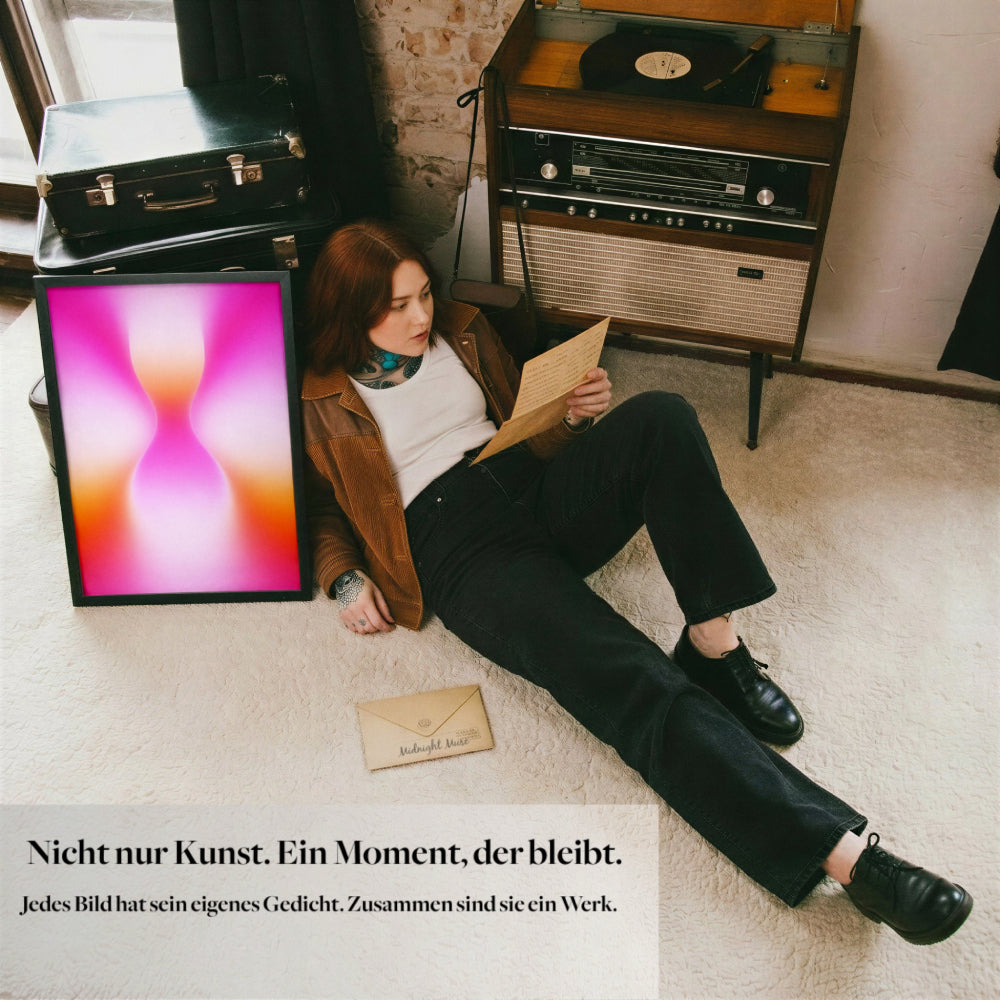 Weil Midnight Muse Kunst als Zusammenspiel von Bild und Bedeutung versteht. Das Gedicht ist kein Zusatz, sondern Teil des Konzepts. Es übersetzt die Stimmung des Werks in Sprache und verankert es emotional. So entsteht keine reine Wandkunst, sondern ein persönlicher Bezug, den viele bewusst aufbewahren, separat rahmen oder in ihren Alltag integrieren.