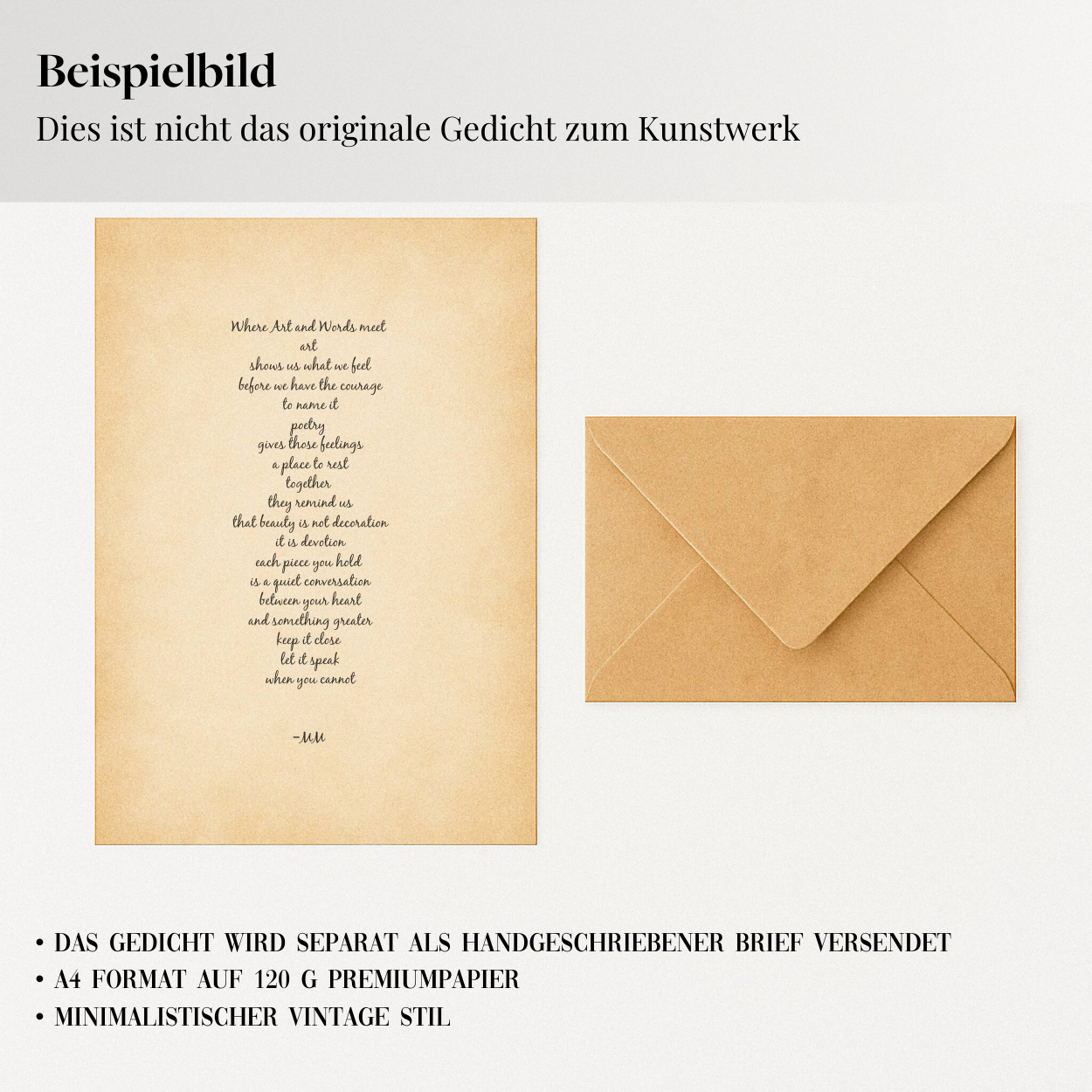 Du erhältst einen Galerie Fine Art Print auf schwerem, archivfestem Papier in Museumsqualität, gefertigt mit professioneller Giclée Technik. Wenn du einen Rahmen auswählst, kommt dein Kunstwerk fertig gerahmt zu dir, inklusive handgeschriebenem Gedicht Brief, bereit für deine Wand.