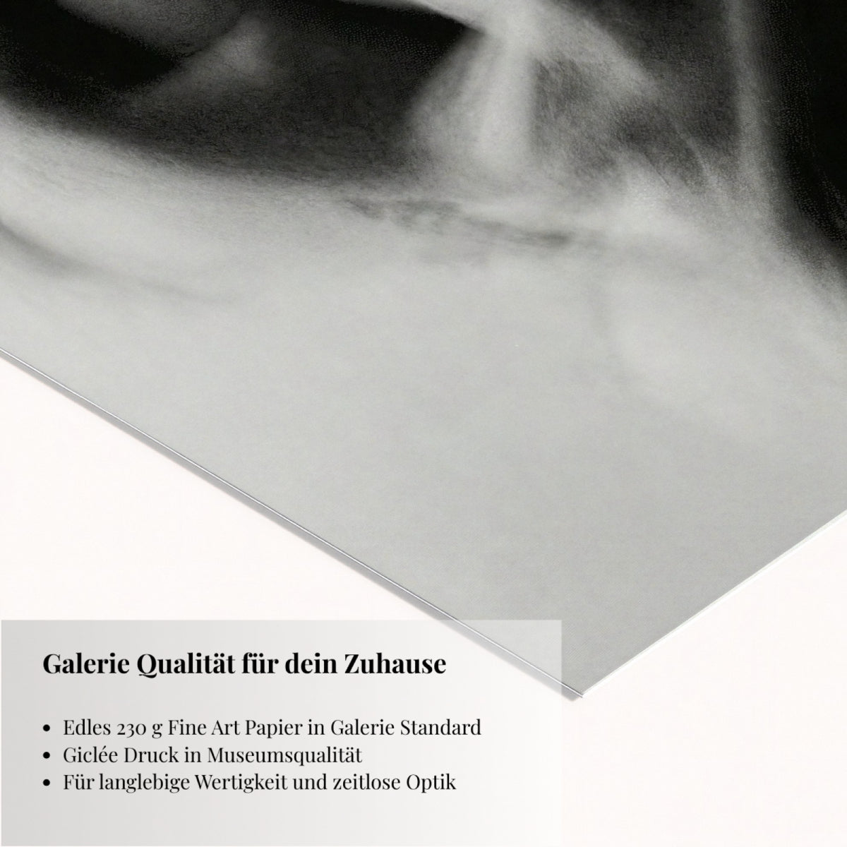 Lips, Tongues, Bites entfaltet eine rohe, intime Nähe, die sich zwischen Licht und Schatten auflöst. Die weich verwischten Körperformen wirken wie ein Atemzug auf Papier, voller Spannung, Begehren und stiller Verletzlichkeit. Schwarz und Grau verdichten sich zu einer zeitlosen Bildsprache moderner Kunst, die Nähe nicht erklärt, sondern fühlbar macht und emotionale Tiefe mit zeitgenössischer Fotokunst verbindet.