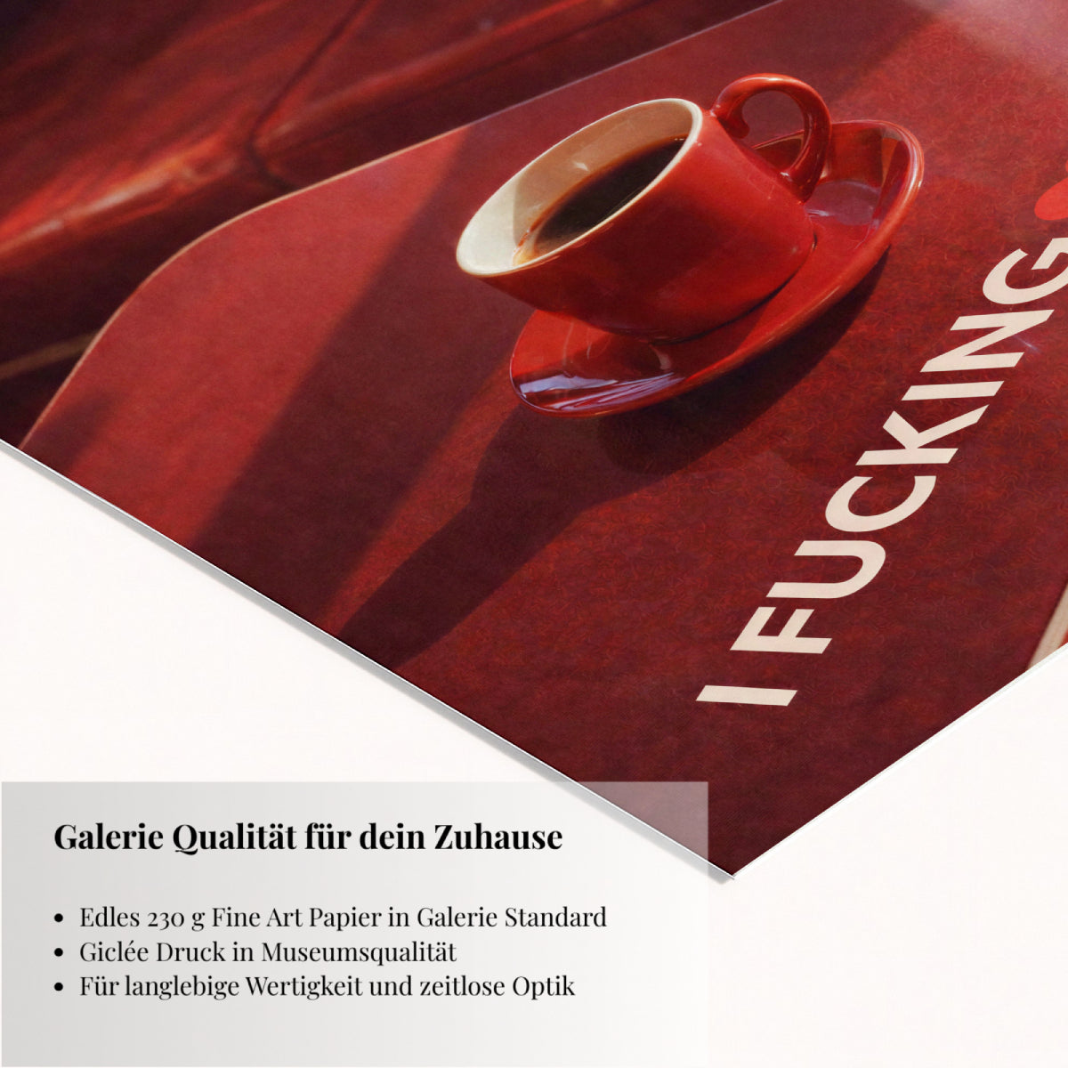 Love On Repeat Dieses warme Stillleben aus Rot, Licht und Alltäglichkeit übersetzt Begehren in Gewohnheit. Eine Tasse Kaffee, ein Tisch, ein Satz, der bleibt. Liebe erscheint hier nicht als Ausnahme, sondern als Wiederholung, roh, ehrlich und ungeschönt. Die Szene verbindet intime Ironie mit urbaner Lässigkeit und macht aus moderner Fotokunst einen stillen Kommentar über Nähe, Alltag und Verlangen.