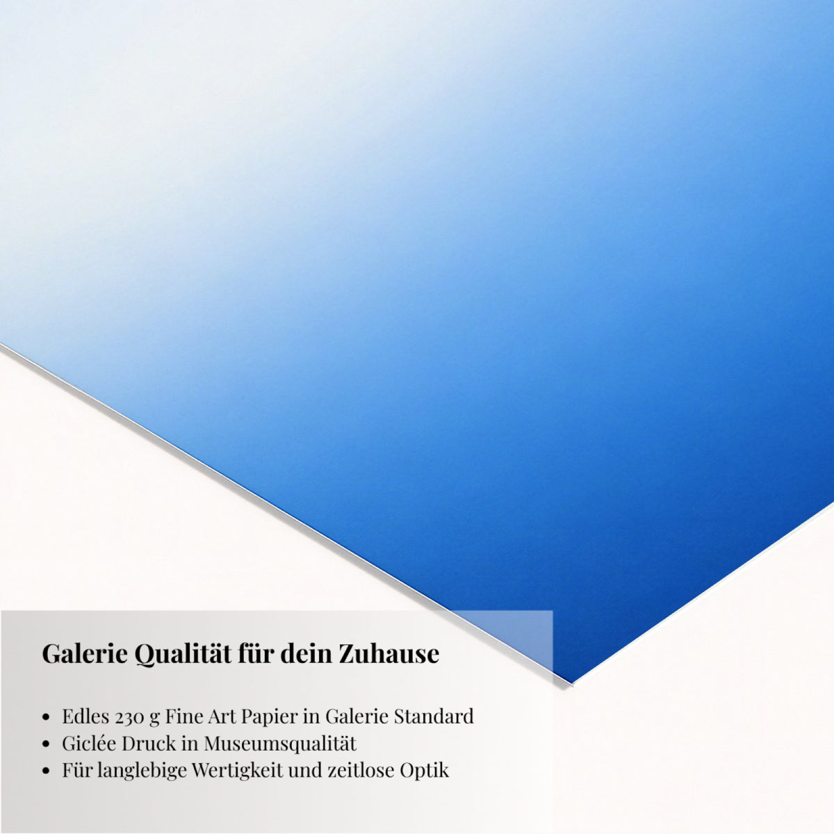 Wir verwenden 230g schweres Fine Art Papier mit spürbarer Struktur und archivfeste Tinten. Die Museum Giclée Drucktechnik sorgt für klare, tiefe Farben und feine Übergänge, wie man es aus Galerien kennt. So bleibt dein Kunstwerk viele Jahre farbstabil und wertig.
