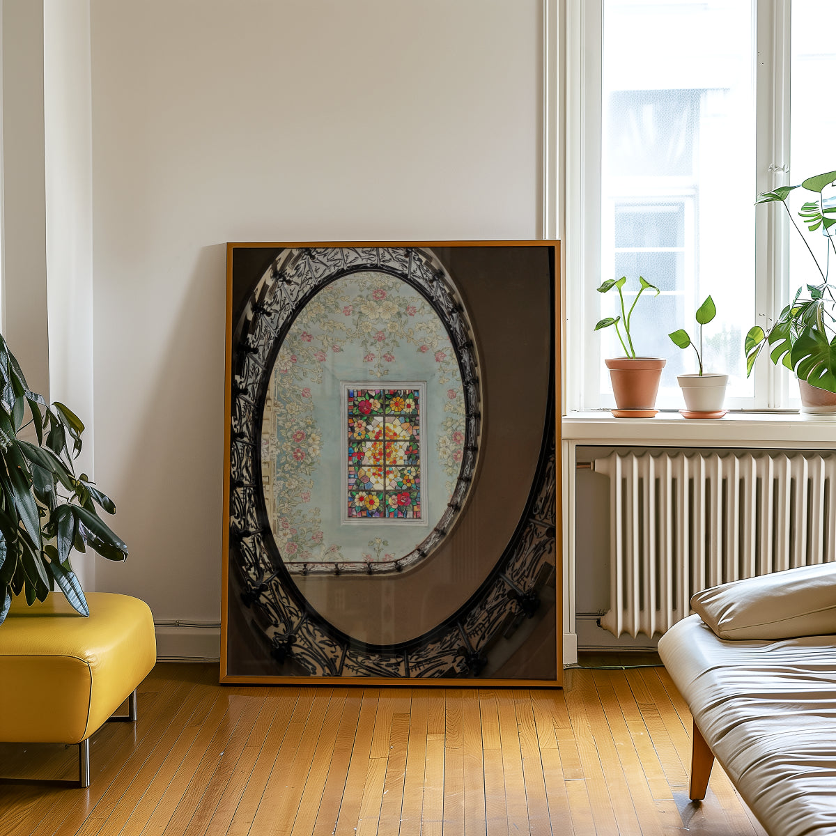 Ornamental Dieses Werk öffnet den Blick in eine stille, fast sakrale Welt aus Ornament, Licht und Zeit. Das florale Dekor umrahmt das farbige Glasfenster wie ein poetischer Atem aus vergangener Eleganz. Zarte Farben, geschwungene Linien und architektonische Ruhe verbinden sich zu moderner Kunst mit historischer Tiefe. Eine zeitgenössische Wandkunst, die Raffinesse, Intimität und ästhetische Balance ausstrahlt.