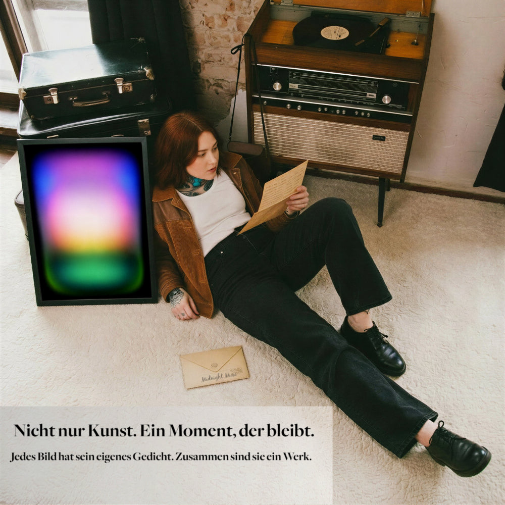 Die vertikale Lichtwirkung bündelt den Raum und gibt ihm Halt. Farben steigen nach oben und erzeugen eine ruhige, kraftvolle Spannung. Die Fläche wirkt wie eine tragende Säule aus Licht. Wände gewinnen Tiefe und Bedeutung. Der Raum fühlt sich klarer, strukturierter und zugleich lebendiger an.