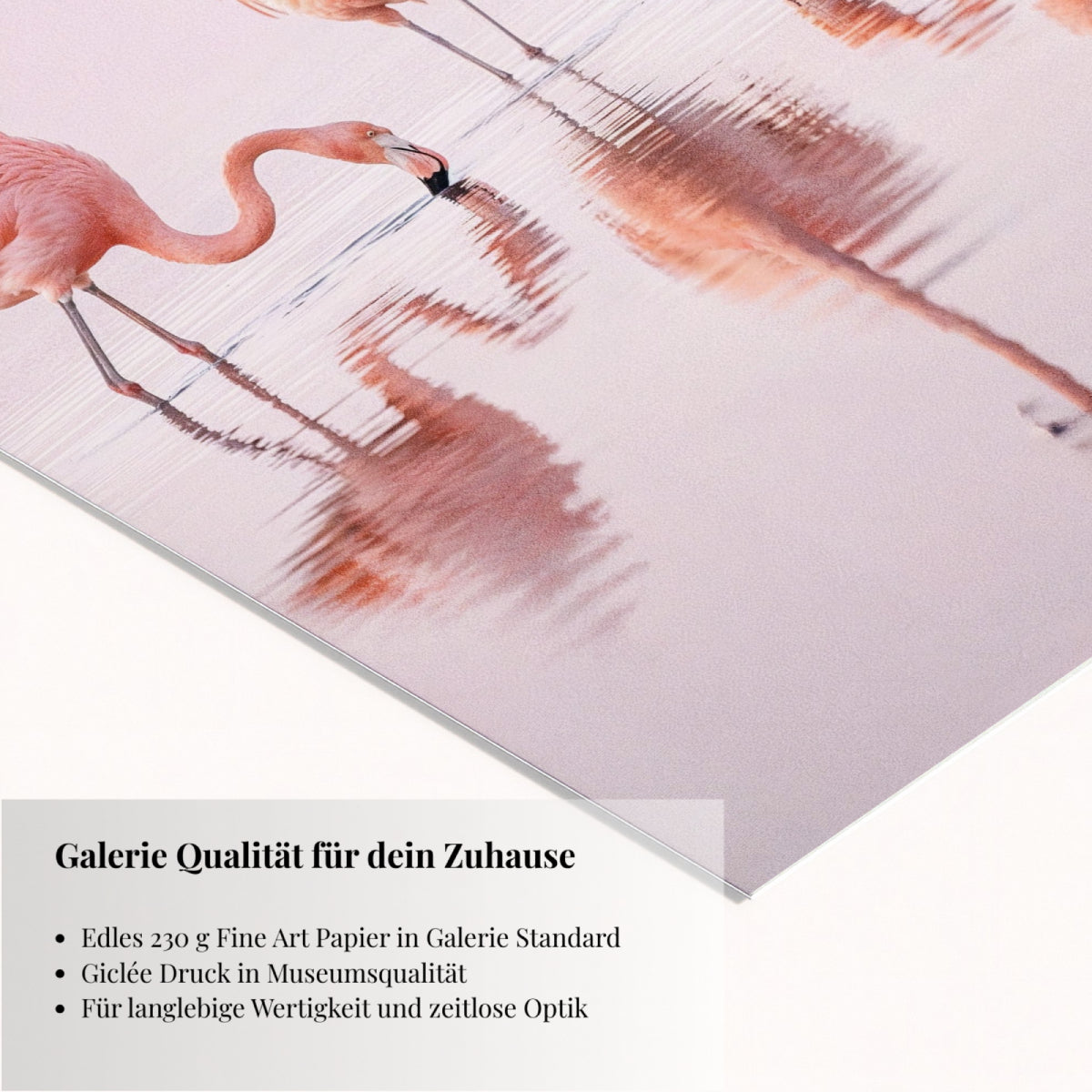 Pink Ritual entfaltet eine stille Choreografie aus Anmut, Spiegelung und sanfter Wiederholung. Die Flamingos stehen im flachen Wasser wie Teil eines poetischen Gleichgewichts, getragen von zarten Rosé- und Pudertönen. Das Bild verbindet zeitgenössische Fotokunst mit einer fast traumhaften Ruhe und wird zu moderner Wandkunst, die Leichtigkeit, Eleganz und eine meditative Tiefe ausstrahlt.