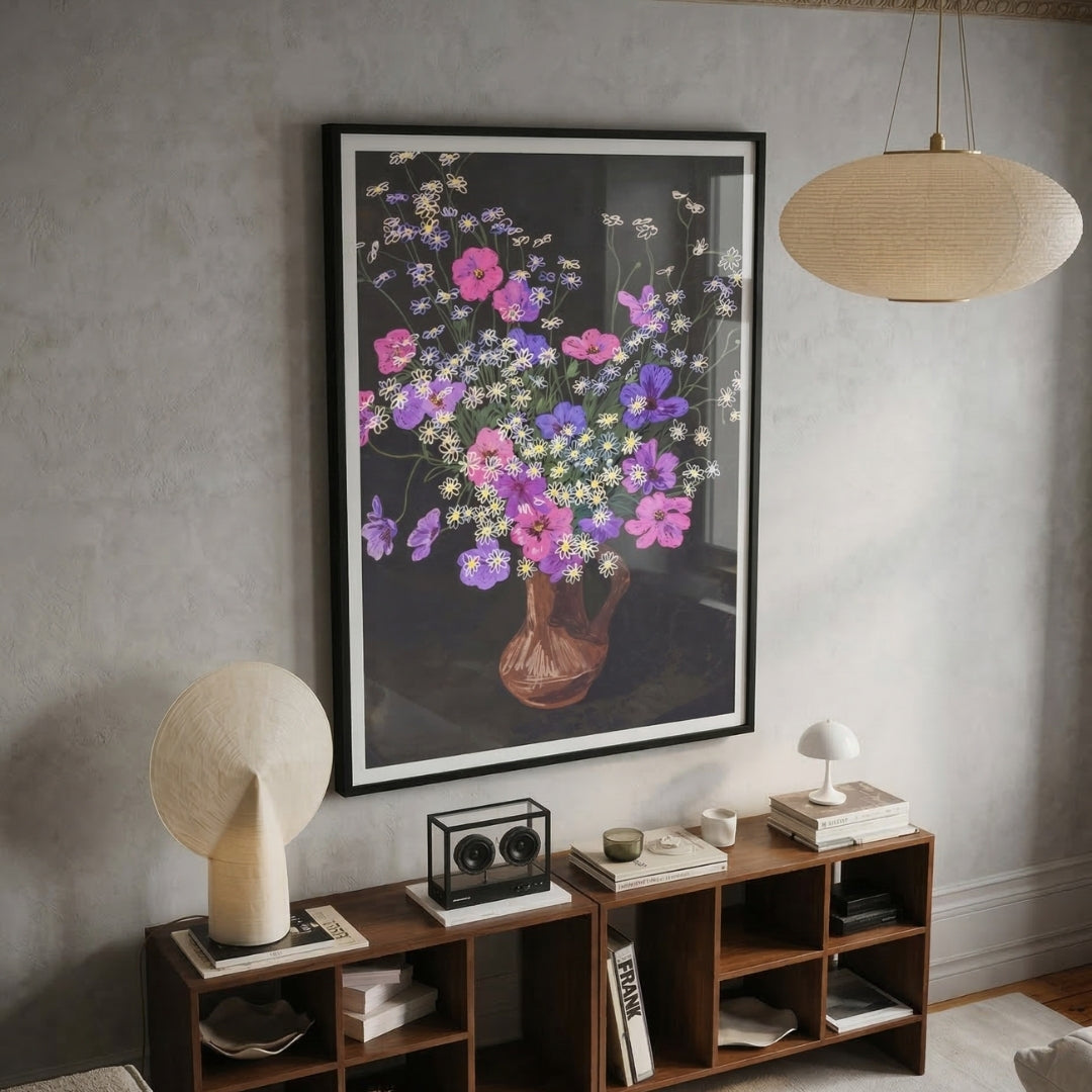 Der dunkle Hintergrund gibt der Wand Tiefe und lässt die leuchtenden Farben besonders klar wirken. Dadurch entsteht eine stille, konzentrierte Atmosphäre, die den Raum sofort ruhiger und persönlicher macht. Das Bild wirkt wie ein sanfter Mittelpunkt im Raum und verleiht der Wand eine elegante, beruhigende Präsenz, die lange bleibt.