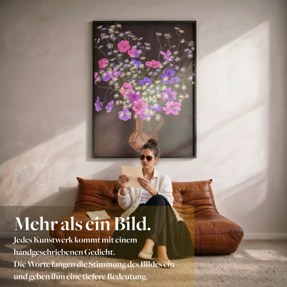 Weil Midnight Muse Kunst als Zusammenspiel von Bild und Bedeutung versteht. Das Gedicht ist kein Zusatz, sondern Teil des Konzepts. Es übersetzt die Stimmung des Werks in Sprache und verankert es emotional. So entsteht keine reine Wandkunst, sondern ein persönlicher Bezug, den viele bewusst aufbewahren, separat rahmen oder in ihren Alltag integrieren.