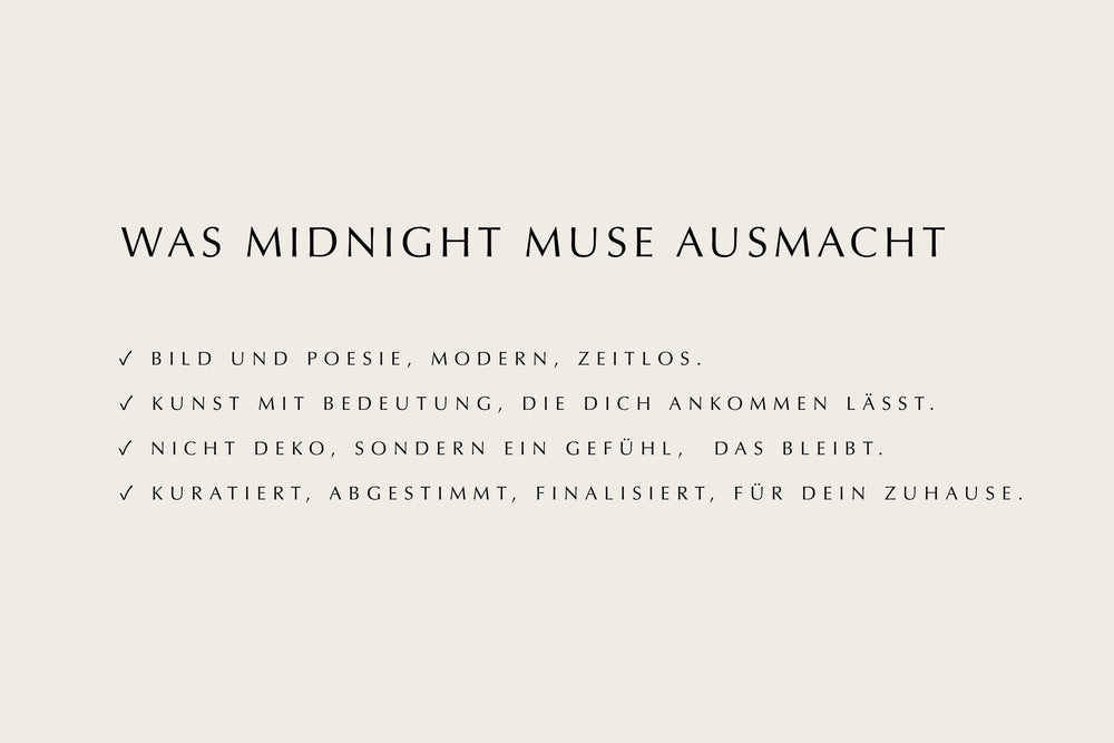 Weil Midnight Muse Kunst als Zusammenspiel von Bild und Bedeutung versteht. Das Gedicht ist kein Zusatz, sondern Teil des Konzepts. Es übersetzt die Stimmung des Werks in Sprache und verankert es emotional. So entsteht keine reine Wandkunst, sondern ein persönlicher Bezug, den viele bewusst aufbewahren, separat rahmen oder in ihren Alltag integrieren.