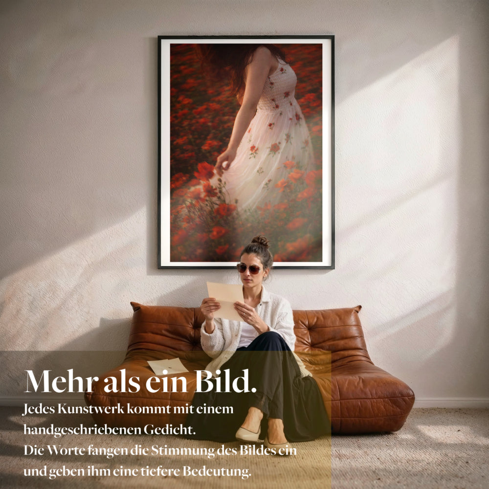 Du erhältst einen Galerie Fine Art Print auf schwerem, archivfestem Papier in Museumsqualität, gefertigt mit professioneller Giclée Technik. Wenn du einen Rahmen auswählst, kommt dein Kunstwerk fertig gerahmt zu dir, inklusive handgeschriebenem Gedicht Brief, bereit für deine Wand.
