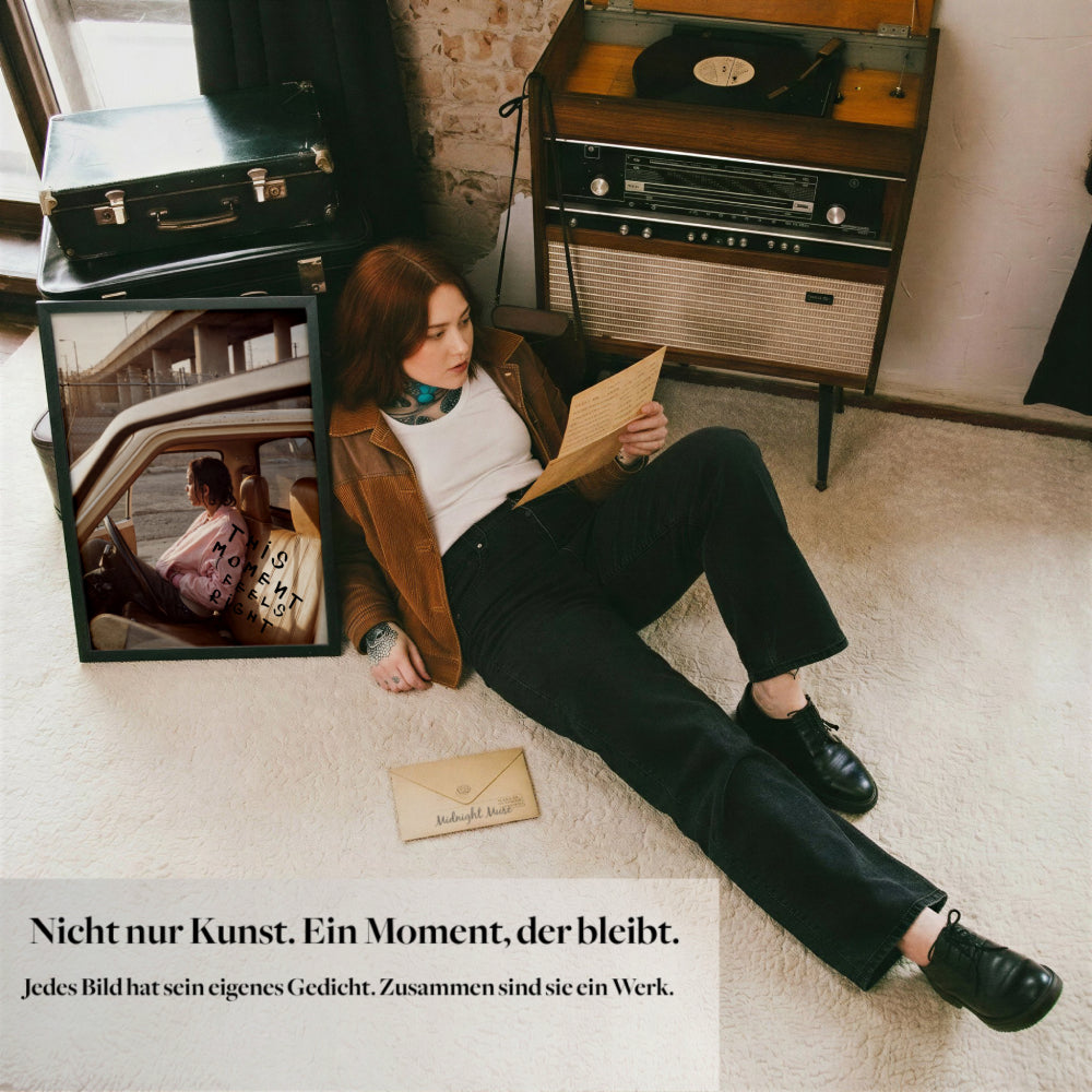 Weil Midnight Muse Kunst als Zusammenspiel von Bild und Bedeutung versteht. Das Gedicht ist kein Zusatz, sondern Teil des Konzepts. Es übersetzt die Stimmung des Werks in Sprache und verankert es emotional. So entsteht keine reine Wandkunst, sondern ein persönlicher Bezug, den viele bewusst aufbewahren, separat rahmen oder in ihren Alltag integrieren.